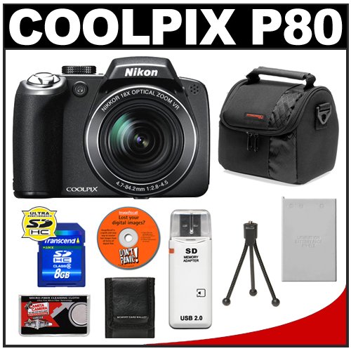 Buy Nikon Coolpix P80 10.1 Megapixel Digital Camera with 18x VR Optical Zoom + 8GB SDHC Card + Card Reader + Spare EN-EL5 Battery + Digital Camera Case |